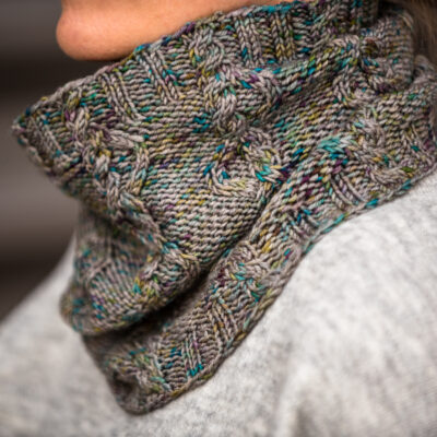 This neck warmer was designed to fit under a jacket and keep you safe from brisk winds and is knit in sport weight yarn. By using three needle sizes, the width gently increases, making the cowl ripple out slightly on your shoulders rather than standing like a tube as you wear it. Stitch pattern is both written and charted.